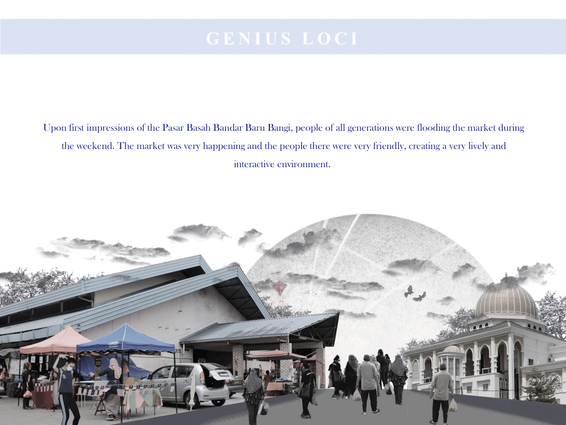 In this semester, we will be designing a Neigbourhood Market and Food Court in Bandar Baru Bangi. The objective of the market is to revitalize the site and existing program. For the purpose of the exercise, it will be assumed that the existing structures on site will be demolished to make way for a new integrated neighbourhood market and food court. In this assignment, we are tasked to identify, analyse, and synthesize the context into their design solution