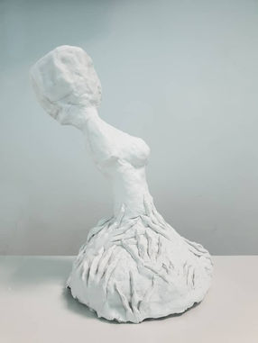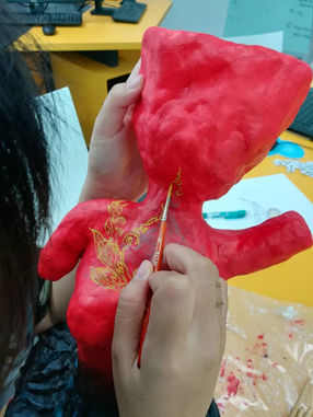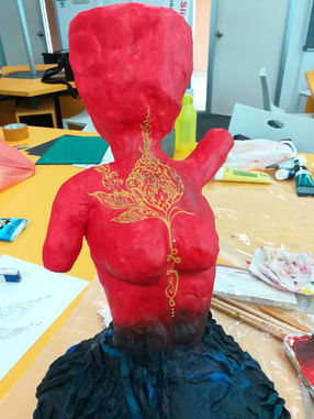 ~ In a traditional mindset, women are seen as emotional, weak and stubborn, and are commonly demonized in myths and folklore stories. Women are often expected to perform in a certain way, to fit the idea of being 'feminine'. Prior to our field trip, our online research indicated that Mae Nak was portrayed as a cruel and vengeful ghost, yet there is a shrine dedicated to her whereby Thai people give offerings and pray to her for blessings. These acts of devotions highlighted the irony of such practice. However, after conducting interviews and in-person research in Bangkok, we realised that some Thais also believed her to be a strong and kind figure who would bless devotees with fertility and wealth. In our final design, the sculpture is designed to have imperfections to depict the real facade of a human. Multiple creature-like hands are sculpted at the base and painted in dark colours, as though dragging the upper feminine form down, symbolising the stereotypes and expectations people place on women, which are simply impossible to fulfill.
